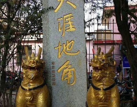 知道瑞丽有个景点“天涯地角”,第一次去的时候没有去。第二次去瑞丽从缅甸边境游回来,出了关境,准备把口岸再兜一下的时候,拐过一个墙角,发现在国境栅栏边上有几个石兽,有块牌子写着“天涯地角”,原来在这里,拍了照片,到此一游。回去看地图,那个地方在西南边境的的一个小角落的尖尖上,还真说得上是天涯地角。
