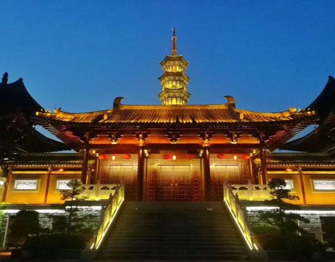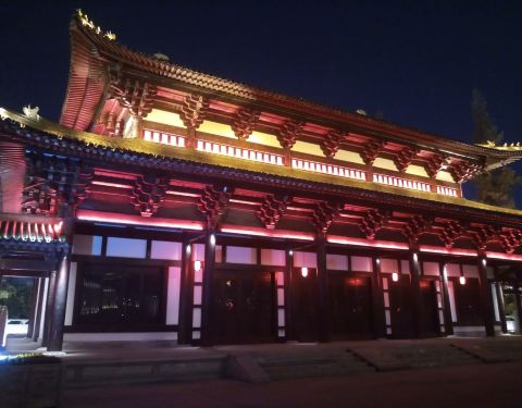 晚上过来看,塔上的灯光效果还是不错的,有四色的射灯,四周的回廊建筑都是朱红色的,也很好看