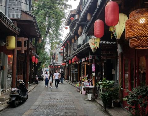 都正街位于长沙市芙蓉街天心阁后门。 这里是一个集多种网红元素为一体的文创美食小巷,与高正街和县正街连为一体,没有太平街和坡子街人那么多,拍照打卡效果更好。 这里古色古香,石板路和红灯笼看起来很有感觉,入口有趣形象的铜像和传统文化建筑都是亮点,还可以体验汉服。