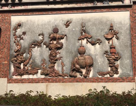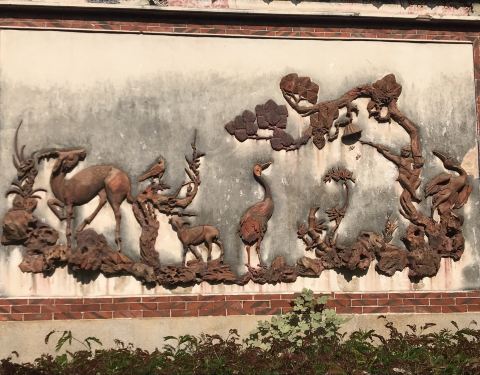 在大开元寺西侧,桑莲古迹与仁寿塔之间,相比人声鼎沸、烟雾弥漫的寺庙殿区,这边的环境清幽许多。壁由三垛组成,左右两垛镶嵌各种神兽和植物,均为砖红色泽,而中间最大的为麒麟,身上的鳞片呈现多种颜色,显得尤为抢眼。石壁原来在泉州府城隍庙前,后来才搬到现址。