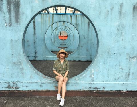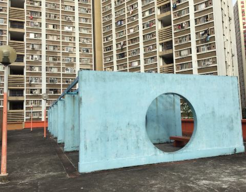 彩虹邨、铜锣湾的励德邨、还有这个乐华南邨,都是网上很红的香港拍照打卡地。乐华南邨的这个位于停车场的天台上,爬楼梯上去吧,天台上有很多淡蓝色的圆形开口水泥墙,多个圆圈贯穿成为一条浅蓝色背景的时空隧道,简单的几何圆圈组成了无穷尽的构图思维。