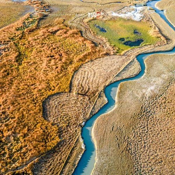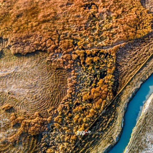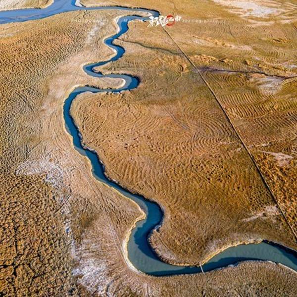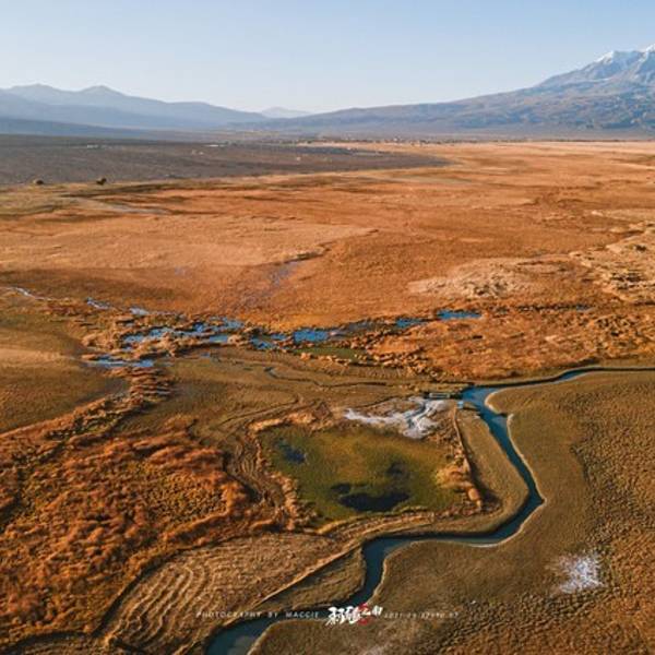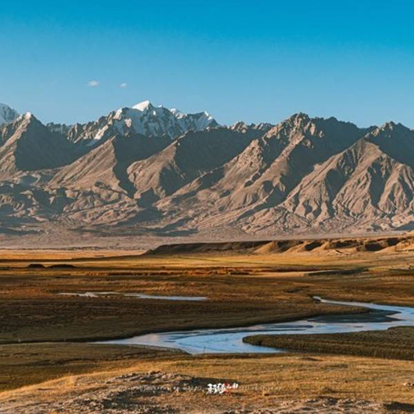 ...士塔格峰下,山脚下是一望无际的湿地草原,中间蜿蜒流淌着溪流,夕阳最后的余晖染金了草原,金光灿灿