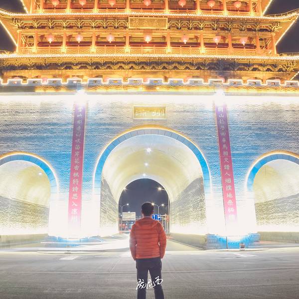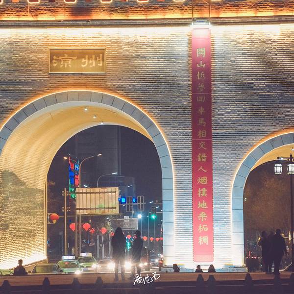 武威是古凉州,城门上写着“凉州”二字,上方还有“银武威”三字,整个城门非常雄伟大气,广场很大,很有气势,与城门非常有协调感,夜景很美