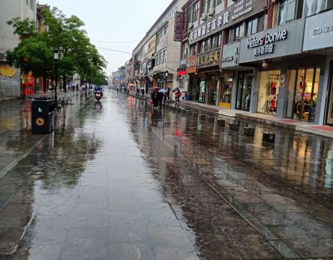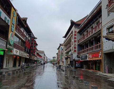 南城门广场,位于武威城中轴线上,由南向北,依次分别是广场---太平鼎---南城门楼,很是气派壮观。广场南端八个大字‘’天马行空,自在武威‘’,气度不凡啊。原城门楼历经风雨战乱,自然损坏,复原后的城门楼倍显雄伟,广场更是十分开阔,由图腾柱、凉州八景、太平鼎、泮池、金水桥、月台等组成,是市民休闲健身的重要场所之一。广场东边就是明清步行街,仿古一条街,雨天的缘故吧 ,稀稀落落的没几个人,貌似并没有影响到商家的热情,打折促销的宣传,充满热情地反复重播,直钻耳膜,好在这样的店铺不多,街面保持了难得的清静闲适,建筑群高低错落,排列整齐,丝丝细雨或轻或重地敲打着青石地面,还是悦耳动听的。整条街以服装饮食为主,集观赏悠闲购物餐饮娱乐于一体,街口靠近南城门位置,设有收费停车场,街区中部有自行车电动车三轮车停车区域,无论本地居民还是外地游客,到此一逛,皆有所获,真是不错 。