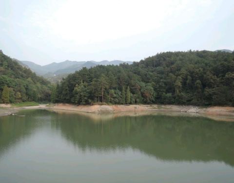 在衡山景区入口不远的山谷里,有一个大坝把水拦住形成一个湖。