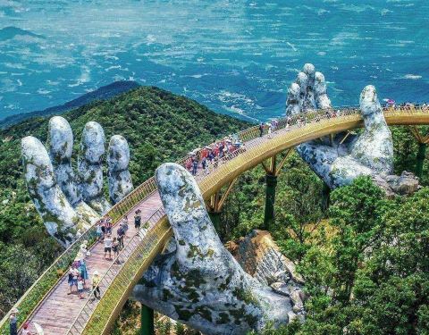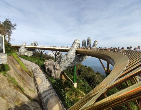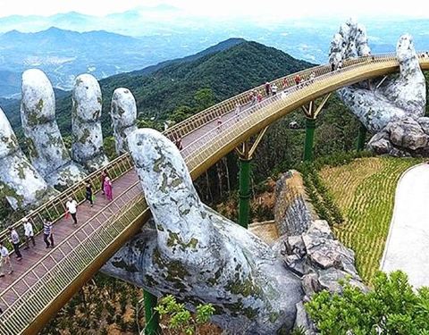 • 全长近150m,在海拔1000多米的山林间拔地而起,仿佛两只巨大的佛手将桥梁托起横驾与山峰至上。 • 将山顶缆车站与令人惊叹的天堂花园连接起来,穿越时您可以欣赏到东海和安南山脉的壮丽景色。 • 手象征着神圣的精神,让游客走在佛手桥上仿佛在穿越上天之手中行走。 △ 乘坐缆车,登上巴拿山太阳世界,欣赏佛手桥。 △ 漫步桥上,放眼四周是秀丽的田园风光。