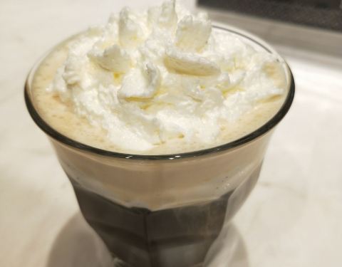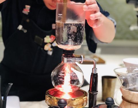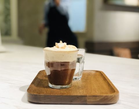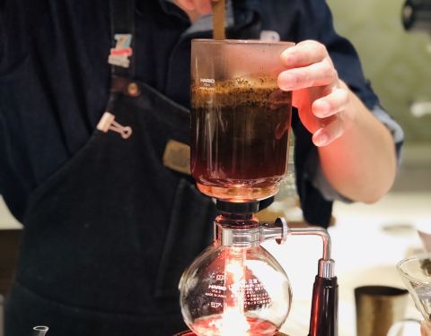 第一次在店里喝,前几次都是外带。看到广告上的爱尔兰咖啡,记忆中没有喝过这款,所以就点了一杯。 整个制作过程与其他款式确实不同,用的是虹吸式的咖啡壶,先是在底下的圆杯中加入威士忌和水,然后加热,通过虹吸原理将水引入上方的杯子中,散发掉一些酒精后,此时在上方的杯子加入磨好的咖啡粉,搅拌均匀后,拿走最下方的加热器。最后等上方的咖啡因为重力全部流入圆杯即可,整个过程比较麻烦,咖啡中还留有一些酒精,适合冬日饮用。