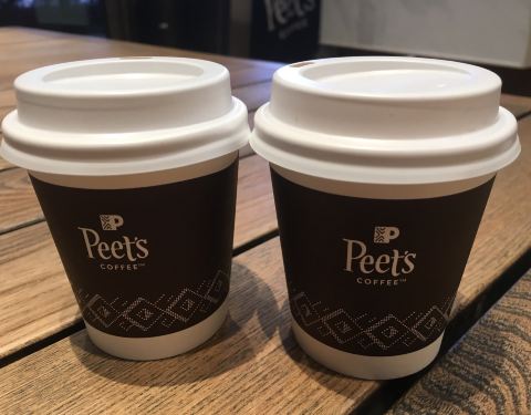 这家peets真的不适合堂食,之前一直都是去5F的,但是早上8点多只有楼下这家开着,那就只能来这里打咖啡了☕️…… 店面不大,不过该有的衍生产品这里都有,最近推出的“致敬上海”活动真的满用心的,杯套、明信片,纸袋都是这一主题,陆续还会分三波推出有奖活动、买赠环保袋等; 4⃣️个咖啡师在咖啡机前奋力坐咖啡,另外四个在收银台,反正一片热火朝天,谁都没闲着... 然而这里的外卖单真心多,外卖小哥都挤在咖啡师前面要么催单,要么高谈阔论的聊天,这样的环境对于顾客而言,真的很不好‼️ 一直点的双子星,出品也不灵光吖,这里全部都是外带杯,堂食也不列外❗️,个么为了节约个纸杯,美式就放我自己的杯里,小杯拿铁第一口差点吐出来,烫的不行噢…… 虽然是peets粉,but这样的咖啡水准和环境真的不敢苟同,希望下次去能有所改善啊!