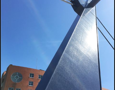 看到吊桥的开合,听说是日本唯一的步行者专用吊桥,一天的开合次数只有六次,想看的话需要算准时间。吊桥的造型是有趣的非对称型,一侧有桥墩和斜拉索,另一侧则只有桥面。晚间桥面两侧会点灯,在水面形成倒影景观。