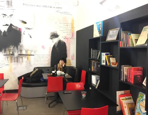 这里是全里斯本最美最古老的书店,和于1732年开业的咖啡馆,B UM AMOR PARA,美仑美幻的粉砖砌成的穹顶,8张黑色的咖啡桌,名星同款的服务生,一款慵懒的星期天茶,咖啡馆自制的苹果派,味道绝佳!穿过长廊是300多年历史的书店,经历了1755年的大地震和2008的金融海啸,而不倒