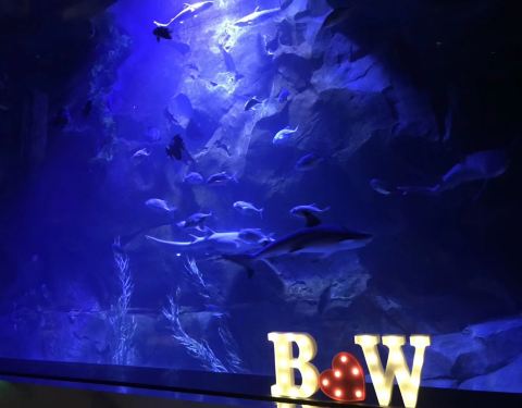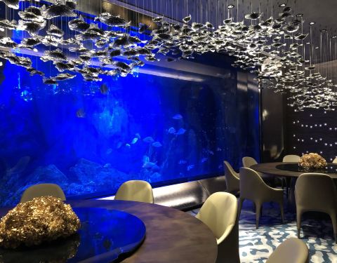 一边享用西餐,一边欣赏水族馆海洋生物。