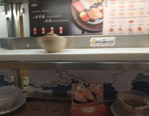 孩子周末在这里附近读书就找附近的店吃晚饭,看评论这家很新颖,有小火车送餐,估计孩子喜欢。5:50到的门口已经人山人海等位了,拿了个号,前面还有29桌。6:30进去的,等了49分钟。服务员介绍下面的都可以自己取,10元一碟,点单的上面会有小火车送过来。抹茶粉、热水都和日本形式一样,就是味道实在一般,凑个热闹来一次就够了。鹅肝寿司和寿喜锅还不错。性价比高。补充一句:碟子扔进槽里可以抽奖也是卖点。