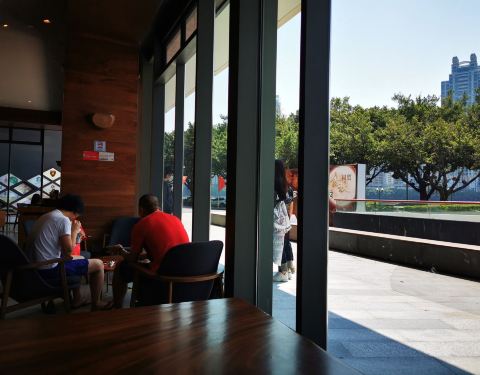周末过来二沙岛参加活动,路过这一家星爸爸,当然就要进去走走、喝喝、休息一下了。这一家咖啡店就在星海音乐厅旁边,挨着的,门口有一排室外座位,基本上每一张桌子头顶都有一个遮阳大伞,一朵朵绿色的大蘑菇,很显眼。室内也有不少的座位,但是经常都是很多人的,有音乐会的时候人多,周末人也多。附近有很多外国人居住,所以经常可以看到很多外国人在这里出入。