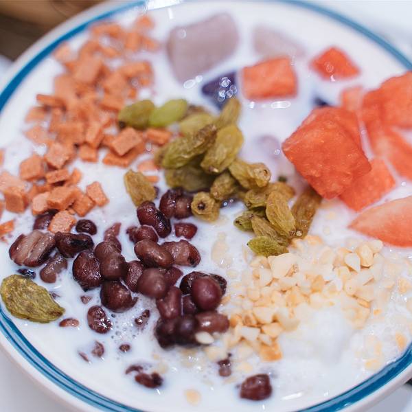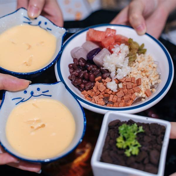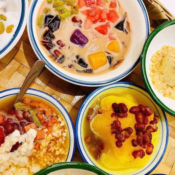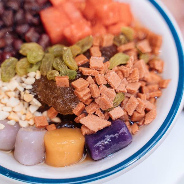 「红糖冰汤圆」冰冰凉凉的冰是用红糖水做的,花生、葡萄干、红豆、西瓜等等配料超级足,吃起来清凉可口又有满足感,甜食控必备。