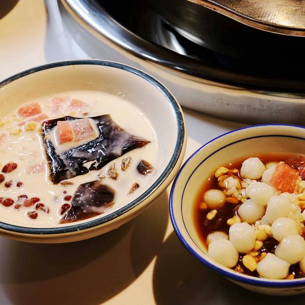 「杨枝甘露」「红糖冰汤圆」「白雪冰汤圆圆」「芒果慕斯」等等一共七八种,都还不错,各种冰汤圆都比现搓的糯,芋圆也是很q弹,他们家用的是好的奶油,动物淡奶油真的是幸福感满满,虽然是火锅店的甜品但是一点不输甜品店。