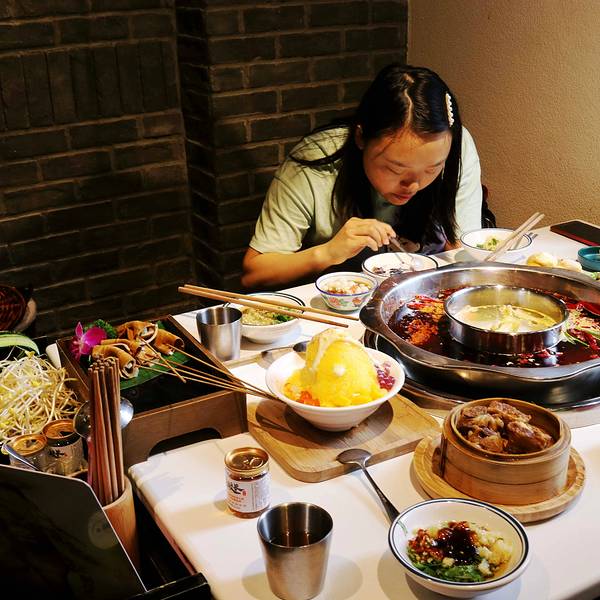 鸭肠七上八下的涮上几秒,微卷就从锅里捞起,挂着牛油,沾上吃鸭肠必备的蘸料入口爽脆。毛肚更是新鲜的不行,肚上的小刺一粒一粒的竖起,在锅里煮一会儿,饱饱地吸满了汤汁,夹杂着牛油的香气混着香油蘸碟扑面而来,鲜嫩薄脆。在重庆,如果吃火锅没有吃毛肚,那等于没吃。