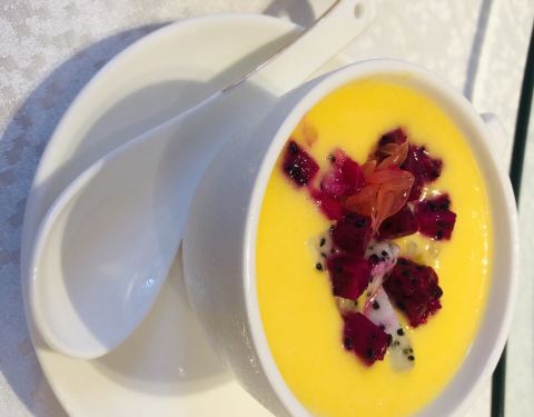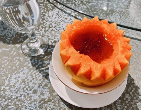 这是一家无论从口味,到环境,再到服务都无可挑剔的一家店!从进门就惊喜连连~ 进门后映入眼帘的就是一个小花园,盛开的花和庭院,仿佛一处世外桃源~流水声和鸟鸣不绝于耳~整个人因为天气太热而浮躁的内心在这一刻突然宁静… 这家私厨里面都是包厢,非常好的保证了客人的私密性,就算是两个人到店都是用的包厢哦~ 「蓝莓山药卷」作为前菜,不仅非常好的打开了我的味蕾,更是因为其冰冰凉凉的奇特口感,一下就让我差点在外面热死的身体降了温!简直就是这个季节的必备良品! 「海鲜艇仔粥」一碗好的艇仔粥所用的配料需要精心的挑选~而他们家的艇仔粥就好的无话可说!新鲜饱满的大虾,肉质Q弹~干贝、鱿鱼等等等等!完美的附和了艇仔粥的味道!