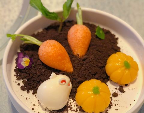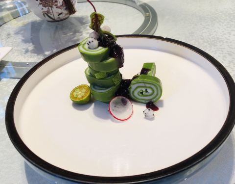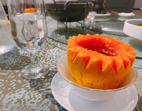 装修很有年代感的一家私房菜,刚进门的小庭院很吸引眼球,在这里共进晚餐蛮有情调~ 第一道上的是蓝莓山药卷,糯糯的卷混合淋着的蓝莓酱,精致好吃。 接下来的上的是我最爱的一道菜。味淋蓝日鲍配樱桃鹅肝,很好听的名字。其实在这之前我本身对鹅肝比较无感的,但是他们家的让我对鹅肝有了新的认识。很浓厚的香味在嘴里化开,青柠根据个人口味来加,一点也不会有腻的感觉[调皮] 其他菜品也都很好的体验,点心有很可爱的兔兔和小造型,海鲜艇仔粥料真的超级足!