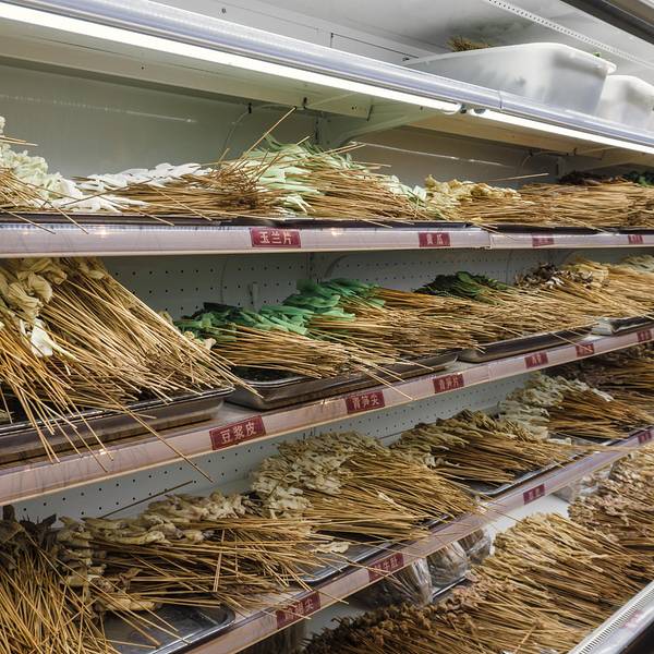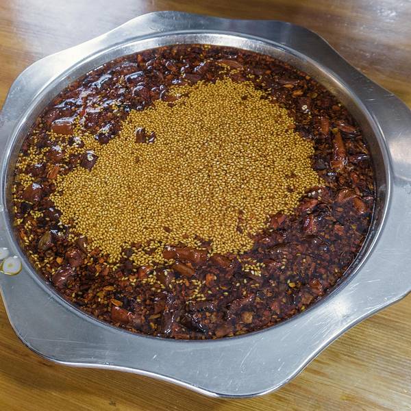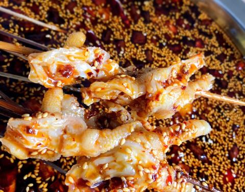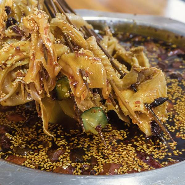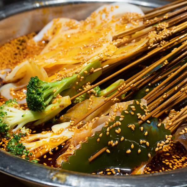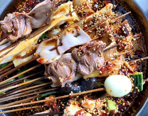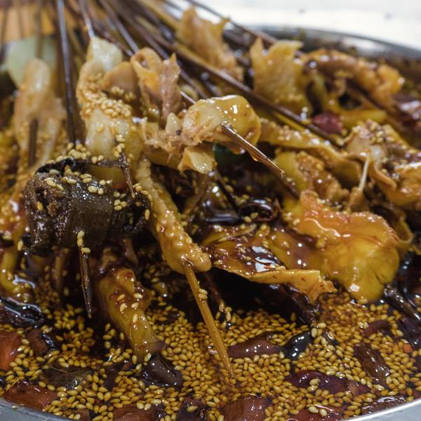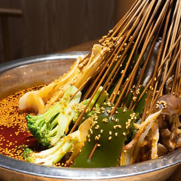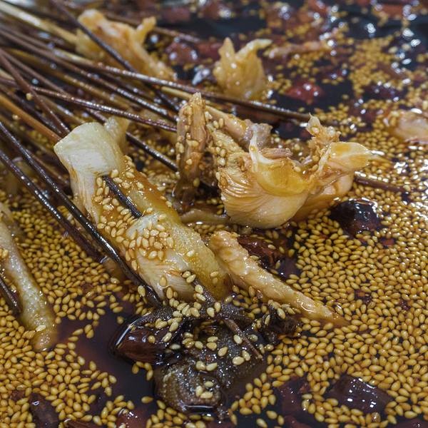 首推的,必然是红遍大江南北的钵钵鸡据说钵钵鸡起源于上世纪80年代,乐山人调制好滋味十足的红油,把煮好的鸡肉浸入红油,放到土窑烧的钵里,挑着出去沿街售卖。那时候人们的生活都还不算富裕,每次都买一只鸡就有些过于奢侈了,于是就把鸡肉、鸡杂等等穿在签子上,方便自选。后来慢慢发展成了今天的样子。钵钵鸡其实是冷锅串串的一种,所有菜品都是已经煮熟的,串在签子上,分门别类的放好。食客们选好串串以后,放在装满红油的盆里捞一下就可以吃了秘制的红油在白芝麻的掩映下散发着诱人的新引力,不管什么食材放进去都会变得活色生香起来钵钵鸡要吃出精髓