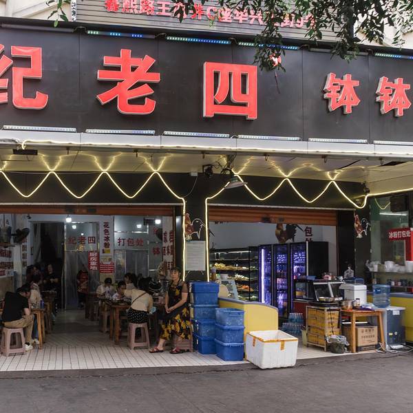 和叶婆婆相比,纪老四的店面就比较符合我印象中的钵钵鸡了。几间门头房连在一起,谈不上什么装修,典型一副大排档的样子。下午四点钟左右到的时候店里就已经有不少人了,据店里的嬢嬢说吃钵钵鸡不分时间的,从开门到打烊都有人在吃点单上菜的程序也不一样,找到座位后嬢嬢会先给上一盆红油锅底,然后自己去选串串,拿回来直接放在红油里面就可以吃了红油虽然是冷的,但端上来就可以闻到香味,红油上面不要钱一样的漂着一大把芝麻和辣椒虽然整体环境一般般,但摆放串串的冷柜还是比较干净的。菜品基本上也都是蛮新鲜的,毕竟这家店的客流量也是真的很大鸡肉、鸡爪、贡菜都是必点的,我口味算比较重的,所以喜欢点毛肚、郡肝、西蓝花等等这些比较能挂汁的东西纪老四的红油汤底绝对是我爱的那款,红油里的辣椒是经过处理加入的,能吃到辣椒过油的味道,很香但不会过于辣。红油的盐度也是合适,毕竟串串只是短暂的进去捞一下,盐度低的话就感觉实在是没什么味道了。店名:纪老四钵钵鸡