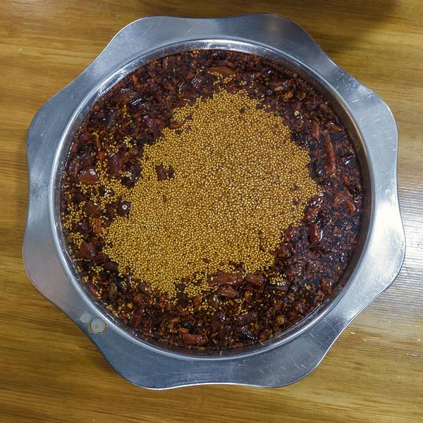 在乐山可以和叶婆婆齐名的店铺。下午两三点钟,生意依旧火爆,服务员忙里忙外,基本没空搭理人,以至于上菜速度巨慢无比。好在钵钵鸡和蒸饺的质量很高,弥补了服务的缺陷。钵钵鸡的精髓在那一盆红油里,吃得淡的裹一层芝麻,吃得咸的可以在红油里多泡一些时候,无论怎样吃都鲜香极了。PS:红油带些甜口,应该放了不少甜,有忌口的人要少吃。