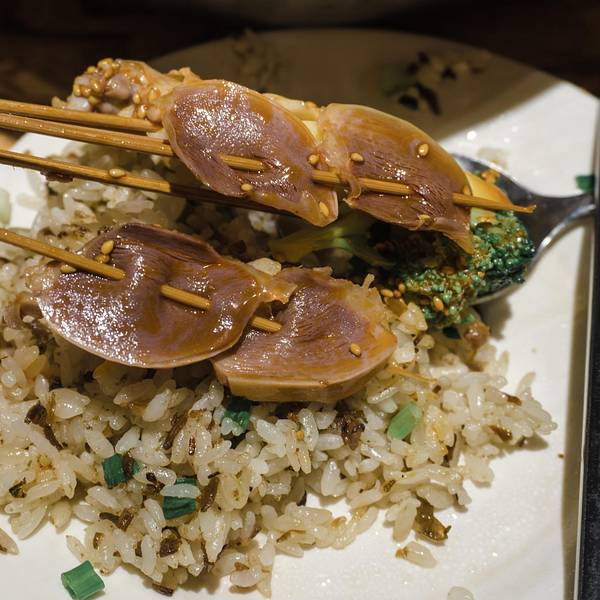 [憨笑]现在青岛回味乐山, 最让人回味的就是低物价了吧, 百八十搞定一顿饭, 舒服的很…… 随便吃,数签签 [委屈]其实他家的食材不见得新鲜, 有点粘粘的感觉, 不清爽让我就取了很少 「鸡汤饭」味道寡淡的很...