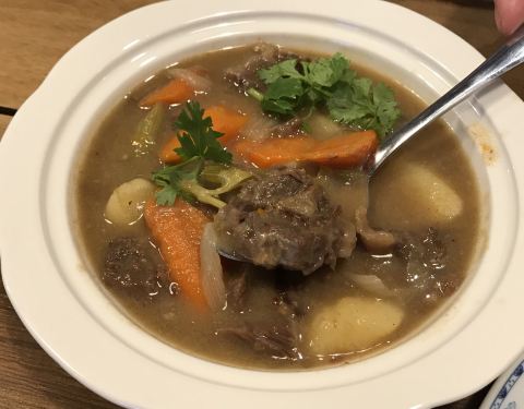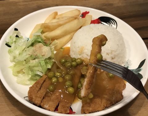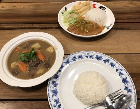 接孩子们放学,经过餐厅,就弯进来喝茶,吃个点心。老板推荐新菜品,有海南猪扒、海南炖牛肉、炸笋粿和咖喱卜,孩子们都要尝一尝 海南猪扒是裹饼干屑去炸的,特别酥脆好吃,再淋上开胃的酸甜酱,孩子们每人吃了一盘。我点了海南炖牛肉,这是西式煮法,加了土豆、芹菜和胡萝卜一起炖煮。 饭后再来番薯蛋、咖喱卜和炸笋粿,吃得好饱哟