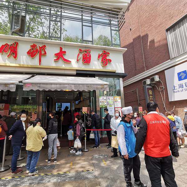 - “光明村大酒家”是国营老字号上海本帮菜餐厅,排队的叔叔阿姨觉得这家餐厅比旁边另一家老字号“老人...