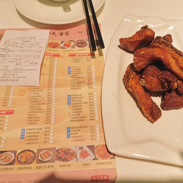 来上海如果不品尝一下正宗的本帮菜显然不太符合美食之旅的宗旨,所以在诸多本帮菜代表中选取了一家位置与我们行进路线比较吻合的光明屯大酒家,而这也是许多老上海推崇备至的老字号。一楼外卖窗口,二楼小吃类点...来上海如果不品尝一下正宗的本帮菜显然不太符合美食之旅的宗旨,所以在诸多本帮菜代表中选取了一家位置与我们行进路线比较吻合的光明屯大酒家,而这也是许多老上海推崇备至的老字号。一楼外卖窗口,二楼小吃类点餐,三楼酒店类炒菜,价格一层高过一层。比较遗憾的是特色酱鸭卖没了,不过好在我对鸭肉不是特别感冒,而且其他菜品总体而言也没有让我失望。更难得的是,作为老字号,店里大部分工作人员都非常热情,但有一个喜欢斜眼看人的女服务员说话特别难听,跟好几个客人说话都是爱答不理的样子,包括对待一个年龄很大的上海大爷,一点都不礼貌。
