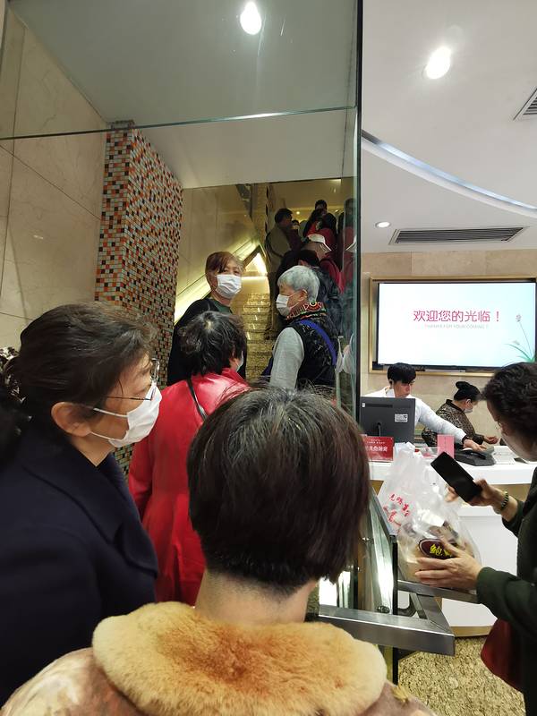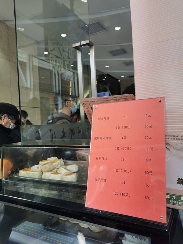 “光明村大酒家”是国营老字号上海本帮菜餐厅,排队的叔叔阿姨觉得这家餐厅比旁边另一家老字号“老人和饭店”好吃。刚出锅的鲜肉月饼据说从早上就有,中午十一点过来排队半小时才买到,赶上饭店儿队长排队慢。左...