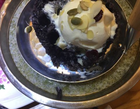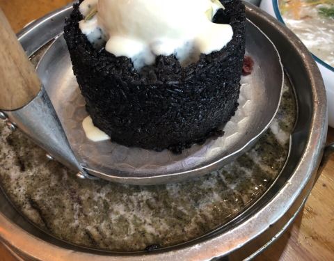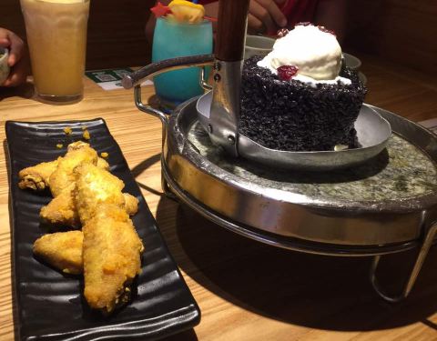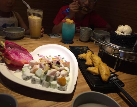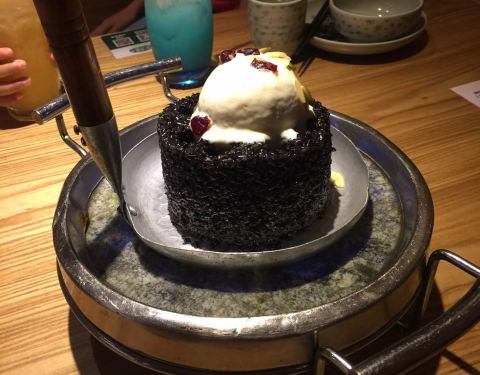 位于万象城内,一半的座位是临湖,一边看风景一边品尝美食。 特别推荐桃花坞酒酿桃胶,三色的小丸子加上酒酿加上桃胶,清甜爽口。 燃烧吧,蜂窝煤:黑米做成蜂窝煤形状,加上一个冰淇淋,很有创意。