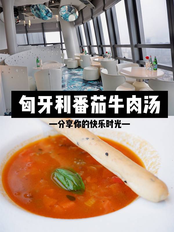 最美的高空环境餐厅 如果能找一个天气晴好的日子 那么白天在这里用餐肯定超级完美了吧 只是我们去的那一天 下雨了 不过雾蒙蒙的餐厅没有人,反而有一种别样的舒适感 🍲匈牙利番茄牛肉汤 酸甜可口的番茄汤,里...