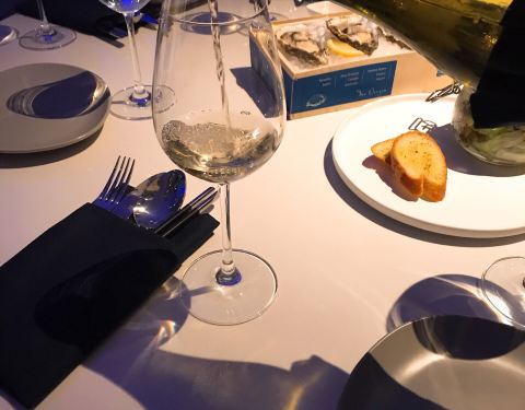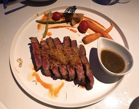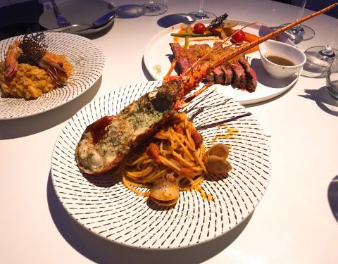 这家餐厅位于阿拉宁波人都知道的玉米楼内,电梯平稳将我们送至33楼,电梯门口,就传来优雅的音乐声! 一侧是大幅的黑黄色构成的南瓜墙绘,步入餐厅,吧台居中,将最棒的靠窗景观都留给了顾客。 我被一个大猪蹄子给吸引了,哈哈哈,这应该是享誉美食届的伊比利亚小河塞5J黑毛猪火腿吧? 我觉得,餐厅最出色的设计就是用将屋顶装扮成了星空,并运用了大量的镜子,以增加空间感和穿越性,在舒适的就餐环境中,佐以的浪漫而慵懒的轻音乐,怎不令人为之倾倒? 吉拉多生蚝Gillardeau看着就一盏盈肥的蚝肉,看着就让我口内生津,挤上几滴柠檬汁,囫囵吸进嘴里,滑爽润舌,清甜的回味,带给我美妙的海味体验。 意大利手工肉肠拼盘Italian home-made Antipasto我最喜欢标配般存在的帕尔玛火腿,其咸中透鲜的口感,能充分刺激我的食欲,对后续菜品充满了期待感。 奶油蘑菇汤Cream of mushroom soup接触最多的法国汤品了,咸鲜透着浓郁奶油香甜味,我是一直百喝不厌。 澳洲谷饲180天牛眼肉Australia 180days beef rib-bye摆盘漂亮,切为条状,肉色粉红,谷饲眼肉之鲜美多汁,完美呈现。 藤椒烧鸡意大利面Rattan pepper chichen with spaghetti olive oil藤椒做为花椒的新品种,最近很受食客欢迎,将其与最百搭、最传统的Spaghetti相搭,微微的麻辣感使得意面顺滑而不粘连,软硬适中有嚼劲,味道丰富多层。 俯瞰三江夜景,近揽明月在怀,人生之大幸也!