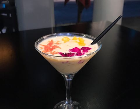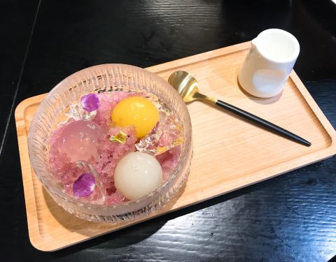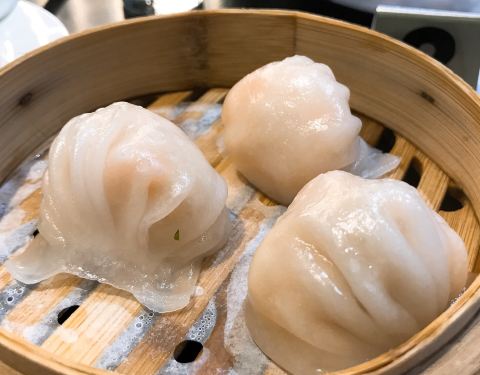 注意到这家是某大佬强烈推荐了分子甜品,水果球,确实,令人眼前一亮,三种口味的小球,荔枝、椰子、芒果,晶莹剔透,很精致,非常薄的皮包裹着果汁,吃到嘴里就是水果爆炸的感觉,凉凉的清爽,旁边的碎啫喱冻也能食用,很轻盈的口感,配了一小杯鲜奶,可以倒在里面调味,甜品的创意巧思已经摆在这里,味道也做的非常棒,米其林二星甜品师没有白请 food library,想做无国界料理,在我看来越是涉及菜系多越是做不好,老板似乎是香港人,所以其实是以粤菜为基础,岔开去做各种料理,我们去的已经很晚,过了饭点,就稍微点了几个代表性的点心 虾饺皇、传统叉烧肠粉,味道都还不错的,虾饺里整个大虾仁,肠粉白滑,略有点厚 杨枝甘露,好吃,不多的几个甜品看来真是无雷点 另一桌客人点了酒吃着生蚝,很是洋气,结账的时候翻看了一下下卡片,title很多,很有来头,以后正餐可以再来试试