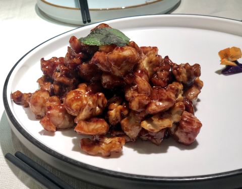 鸡丁口感滑嫩,桃仁很脆,酱汁紧裹原料,没有一点多余的酱汁。 酱爆桃仁鸡、蒜香烩肥肠保留必点菜品