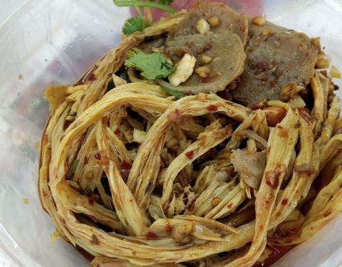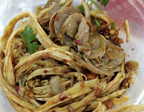 陈记捆鸡,反正打过卡就行了。 并没有传说中的这么好吃,整体是偏咸的。 要了15块钱捆鸡和5块钱豆笋,捆鸡就是切的很薄的肉片,具体有什么我说不上来,豆笋就是一种豆制品,类似腐竹但是吃口感觉不是腐竹。 想让店家多放些辣,回答都是调配好的,想让多放点香菜也没反应,更来不及说不要花生。。。 附近的想吃可以去买买,就是一般熟食的味道。