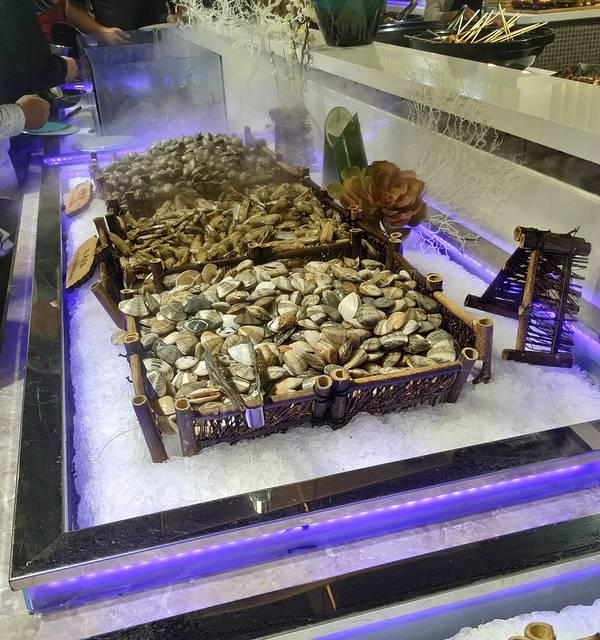 #点评召集令#这是家海鲜自助连锁,之前在鲅鱼圈吃过印象很好,哈尔滨开了之后赶上人少些去吃了一下。人也不少,饭后过后排队半个多小时,排到有些饿了,秩序还好,翻台速度比较快。不过安排位置很有问题,明明四人台坐了五个人,通道特别窄还要坐人,坐在里面的完全出不去,很尴尬。服务真的很差,也很尴尬。 菜品还算丰富,但是在百元自助里就没什么优势了,除了地理位置还不错之外,海鲜品质也一般。 虾片还不错,虽然不是印尼虾片那种品质,不过也比上好佳之类的要好吃一些,油也不大。 假装鲜榨果汁,果汁的部分有点甜,其实没有多少水果,是少量水果加了果酱混合的,特别甜。不如喝酸奶了,还养生一些。 小螃蟹,螃蟹个头很小食活的,店里不提供适合爪螃蟹的工具,智能用两个盘子夹着螃蟹拿走,有些累。 阿根廷红虾是限量的,每次取一个,个头是很大的,不过完全不新鲜,味道也很不好,真心不用吃的。 铁板牛排,也是要排队领取的,口感有点硬,酱汁也不喜欢,实在不是很好吃。 蒜蓉粉丝生蚝倒是不错的,酱汁也是喜欢的,又不排队,可以吃吃。 海鲜不少,不过品质总体来说一般,小虾还算好些,比红虾新鲜。门口两个小锅,汤锅没有盖子,螃蟹会一直动,需要用盘子盖住,很不方便。烤虾海鲜区域小人仙烤肉还挺好吃的,鱼丸,梅肉鸡翅都还不错。红虾,个头很大生鱼片也要排队,不过不是很新鲜,味道不喜欢。小螃蟹,很小的锅里还可以放得下好几个。花甲粉,汤汁鲜美各种烤 不太值得吃店,性价比不高,服务环境也都很一般。