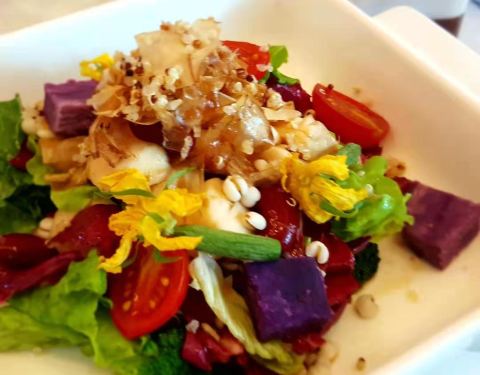 口感层次丰富,颠覆以往主食的概念。脆嫩的黄瓜花,微熟的菠萝切块,让吃草也同样快乐