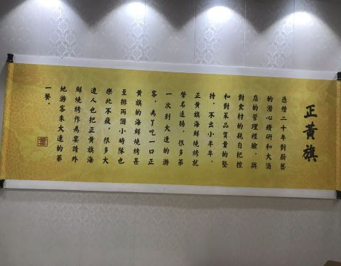 大连美食-海鲜烧烤-正黄旗海鲜烧烤大排档(甘井子万达东市店) 概况[拔草] 来大连吃了好几顿海鲜了,今天知道这家老店是吃海鲜烧烤的,所以满心欢喜的跑来!离市区有点远,离机场还挺近! 位置[疑问] 万达东市这边,临街一楼,不难找! 交通[鸭子] 建议开车或是打车!地铁也行(2号线,虹港路站A出口) 价格[红包] 适中的价格,与菜品质量差不多 菜品[糖果] 整体菜品口感不错,因为海鲜为主,所以部分海鲜通过烧烤后,另有一番风味! 「海肠水饺」 必吃之一,虽然很贵!119元一份好像!不过谁叫这是人家的特色呢!海肠馅不是到处都可以吃到的!口感清爽,味道不错!推荐体验!(后附细节图) 「烤大鲍鱼」 个头还行,烤后的鲍鱼,我个人觉得比蒸的好吃一些!如果没吃过,推荐体验 「黑海胆原壳蒸蛋」 来大连不吃个海胆都觉得对不起自己,不过这几餐因为台风的原因,所以一直没吃上!本次体验,还好来的早,点了八个,只有六个了,全部拿下!口感怎么说呢,还行!能明显吃到海胆!!比原来去SY吃的假海胆好多了! 「烤鱼籽肠」 有点点像烤香肠,不过口感有一些差异!味道还行吧,个人觉得吃几口还是可以的,多了貌似有点腻! 其他的相关烧烤,凉菜等,没有太大的区别,和平时能吃的基本一样,就不一一描述了! [环境][玫瑰] 二层楼!一楼大厅,二楼包间!环境还算不错 [服务][强] 服务还不错,不过能感觉到他们有的还行,有的一般 总结[鬼脸] 大连好吃的海鲜,因为烧烤方式加工,还是有一批自己的粉丝的!整体体验很不错,尤其店内的包间名,一看我就想起了八旗子弟,还蛮清朝的感觉!好了,推荐大家前来体验!