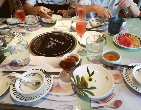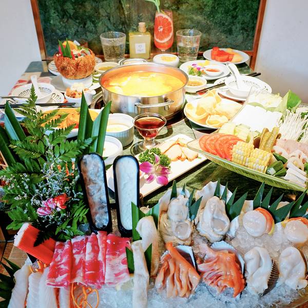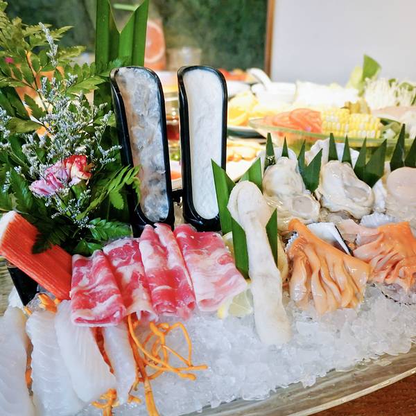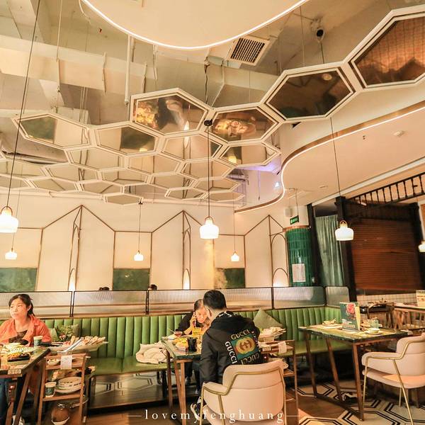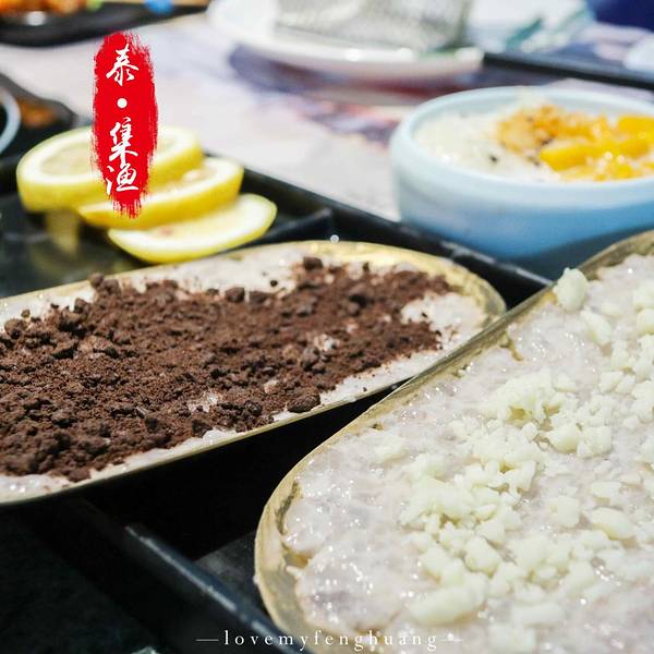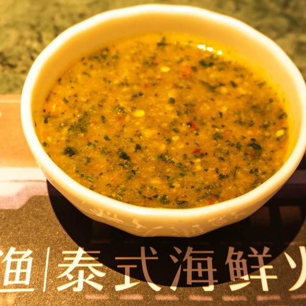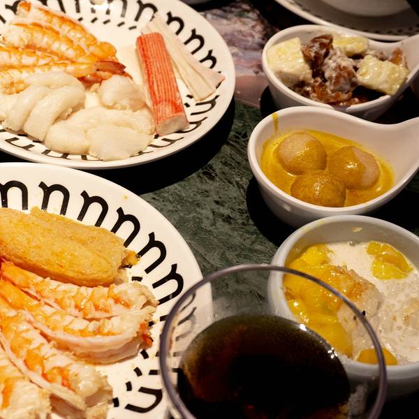 环境优雅,与大部分的火锅店不一样的是,进入到餐厅并没有浓郁呛鼻的烟熏味道,可能和装潢设计有关,找到一处靠窗的座位,来看一看都有哪些美食。【锅底】招牌鲜料冬阴功锅(辣的)、泰式双味锅(鸳鸯)、泰式椰香锅(不辣),比较推荐冬阴功锅底,秘制的料包,味道不错。【蘸碟】调料丰富,经典泰式、招牌柠檬薄荷、香辣海鲜、秘制川香小米辣、川香干碟、浓香花生酱、泰式青酱。比较有特色经典泰式,有股孜然味道;招牌柠檬薄荷,淡淡的薄荷香,很清新;泰式青酱也好吃,但这三个调料都是辣味的,喜欢吃清淡的建议花生酱、香辣海鲜。【特色拼盘】分为海鲜拼盘、小吃拼盘。海鲜有虾贝拼盘、鲍鱼拼盘、肉类拼盘,我点的鲍鱼拼盘,有鲍鱼、蛏子皇、青口。蛏子皇吃起来有点鱿鱼的口感,青口有点腥,沾点调料吃刚刚好。【招牌】 六头鲍:在店门口就已经看到宣传图,特别厚实,Q弹 奥利奥芝士虾滑双拼:吃过虾滑鱼滑很多次,第一吃奥利奥口味和芝士双拼口味的虾滑,奥利奥口味的甜甜,芝士口味吃起来更加丝滑,除此之外还有火龙果虾滑、榴莲虾滑等等,各种别出心裁的虾滑,值得品尝。 招牌咖喱虾:超级推荐,尤其是爱吃咖喱的小伙伴,浓郁的咖喱香丝毫没有遮住虾的鲜味,吃起来很满足。 泰完美:里面有4种,虾饼、炸鲜虾、炸鱼肉,搭配甜辣酱,我最喜欢是虾饼,油炸的要趁热吃才好。 甜点:爆浆蛋糕,我选的熔岩爆浆珍珠的,不但颜值高,而且还很好吃,尤其是里面的珍珠。 饮品:西柚缤纷气泡 赠送: 有限量:哈根达斯冰淇淋球、意大利卡西特气泡酒、芒果糯米饭、茉莉花栋,比较推荐气泡酒和芒果糯米饭。 无限量(人均消费满98元,即可享受免费不限量甜点/小吃/主食): 甜品:每一款甜品都有一个浪漫的名字,种类繁多,都来看看有哪些:一见钟情(水果沙拉)、暗恋(竹耳露)、初恋(布丁)、失恋(酸奶)、热恋(芒果慕斯)、醋意(梅子冻)。比较推荐兔子布丁、酸酸甜甜的梅子冻,很开胃。 小吃:泰式酸辣花甲、薯片好基友(虾片)、当红炸子鸡(炸鸡排)、小吃集市、咖喱鱼蛋 比较推荐的是虾片,虾片是泰式那种很大很厚的,还有小吃集市,里面是3种小吃的拼盘:鸡排、小土豆、粉丝玉米卷 饭:冬阴功彩虹饭、大口吃饭(海鲜炒饭)、大口吃面(面饼),比较推荐彩虹饭,颜值很高。