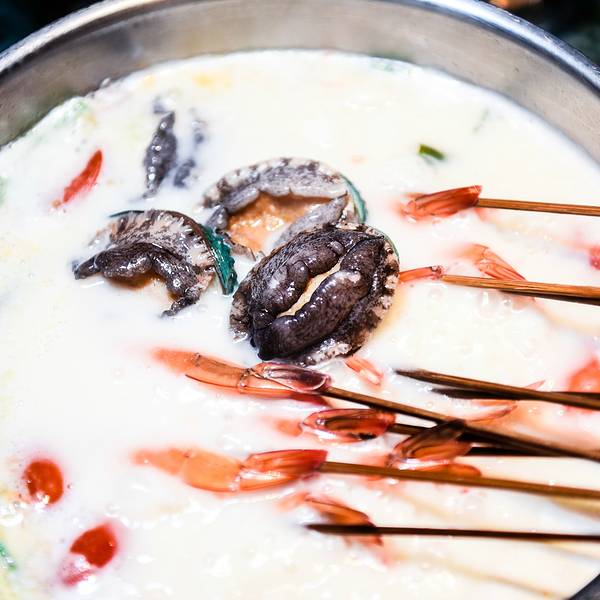 集渔·泰式海鲜火锅同样是火爆异常,提早拿了号以后才可以排到队,但同样的,味 道真 的是完全值得上这份等待。首先这里的环境非常的优美雅致。含有 泰国 风情,却不惊人。很多泰味火锅店显得环境有些暗暗的压抑,这里却透着一股子春意盎然的清新味道。各色各样的火锅小料早就在一旁随时待命,新鲜的椰汁更是可以让你毫无顾忌的酣畅淋漓的吃上一次火锅。乳白色的火锅汤底泛着浓郁的香味,诱人美味,一盘的甜点就等着你吃完火锅而后享用,实在是让人忍不住食吮大动啊。香嫩可口的 波士顿 龙虾,新鲜可口的蟹肉泛着诱人的香味,饱满弹嫩的鲍鱼和生蚝,弹性饱满的鱿鱼,各式各样的蔬菜拼盘,在锅里微微一涮,就变成了各式各样风味迥异的美味。餐厅内会有一个服务员来回推着一辆小推车,里面放着不同种类的小吃、甜品、饮品,从你的餐桌旁经过时,嘴里温柔着讲着需不需甜品,当然这些甜品只要你是在这里吃饭的人,都是可以免费拿的,重点是无限供应!可以吃到你满意为止。虽然是免费无限供应的,但是味道也是堪称一绝。最后再来一杯果酒般的梅子冻,实在是满足到了极点。