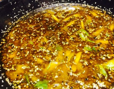 - 要的激情椒麻锅,商家提前在后厨帮我们烹制好了江团,端上桌就可以食用了,表面一层芝麻,看着很是秀色可餐