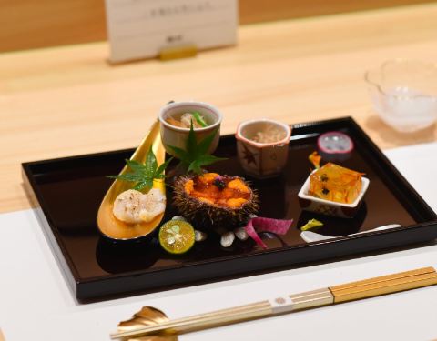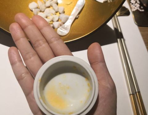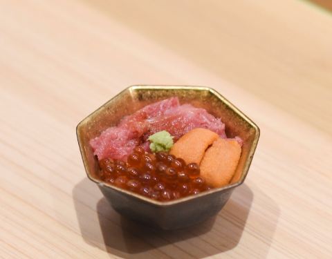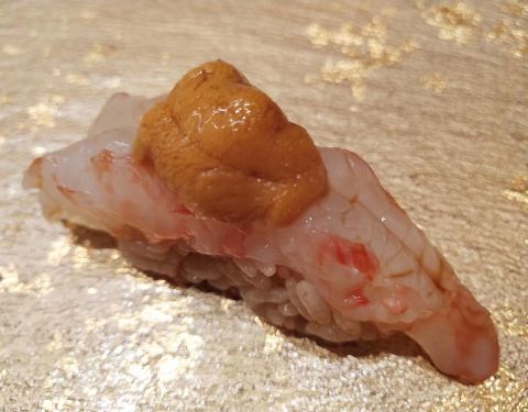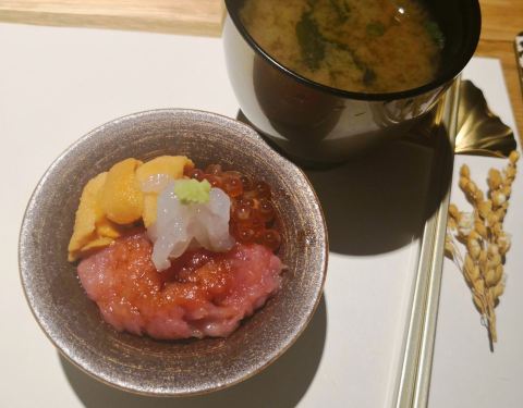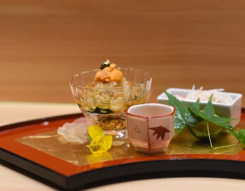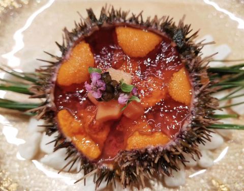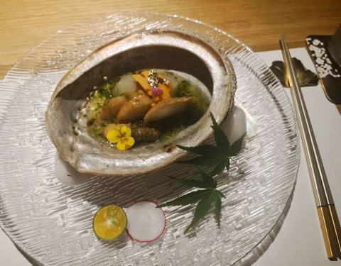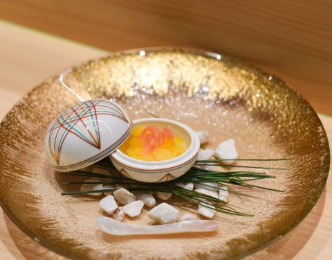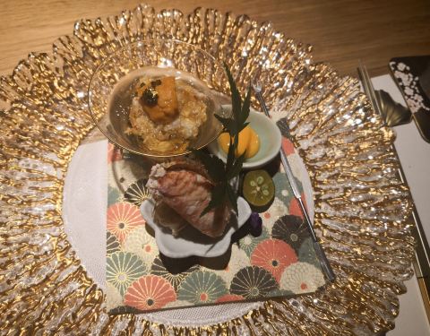 柳营巷里独特的白墙青瓦,沿着庭院的小道走上几步才能进店,门内门外仿佛穿越了一般。进店之后一直有引导服务,入席发现还备了一张预约的小卡,很贴心~和风前菜一共五点,摆盘精致的像幅画!以偏酸的味道为主调,非常开胃~ 「香槟海胆木瓜冻」 配上贝壳勺,小心翼翼入口。木瓜味道浓郁,香槟提供了香气,海胆入口即化,五点之中的最爱!前菜之后的刺身表现也都不错,刀花配和本身的纹理特别好看。料理人根据食材不同的特质处理刺身,食材本身新鲜,加上突出风味的料理方法,吃下来完全没有腻口的感觉。 「柚子冰沙」 转换菜品之间的冰沙非常清新,微苦的西柚把口腔里的油脂都清除的感觉~熟食的前菜选用了雪蟹和海胆,还是以酸开胃为主。其实和最开始的前菜有所重复了。寿司开始我觉得出彩程度降低,调味有点重了,食材的本味不够突出。最喜欢「星鳗手握」,确实入口即化。 「烤银鳕鱼」 印象最深刻的一味菜品。皮脆肉嫩不说,肉汁都很好的锁住,每一口都爆汁的鳕鱼肉好吃哭了。 「迷你海鲜盖饭」 看着小小一份海鲜饭,满满的金枪鱼泥、鲑鱼籽,配上我最爱的海胆,足够丰盛~只是酱油依然多了,叹口气。