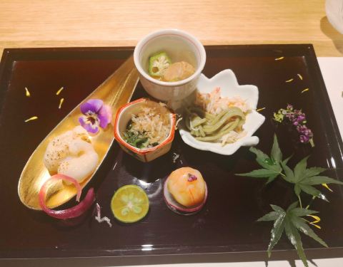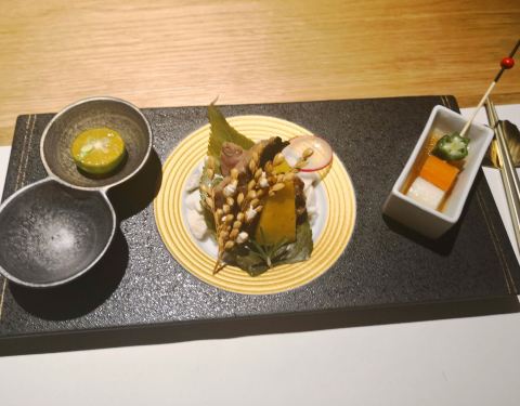柳营巷里独特的白墙青瓦,沿着庭院的小道走上几步才能进店,门内门外仿佛穿越了一般。进店之后一直有引导服务,入席发现还备了一张预约的小卡,很贴心~和风前菜一共五点,摆盘精致的像幅画!以偏酸的味道为主调...
