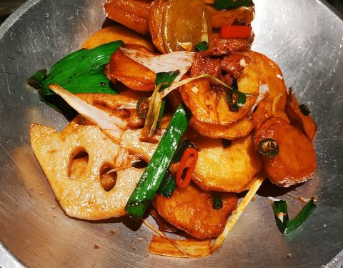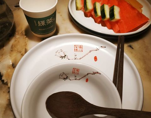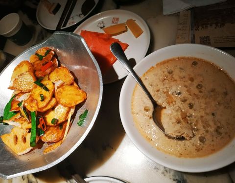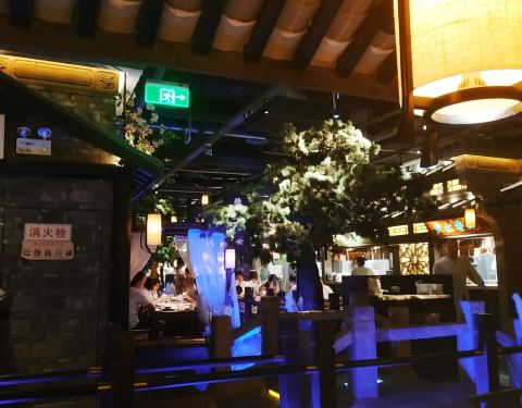 大悦城的一家网红餐厅 里面装修的很有格调 小桥流水亭台松柏 整个环境古色古香 还有一袭白衣女子现场弹奏古筝 气氛烘托的很好 [啤酒][啤酒][啤酒] 因为中午吃太饱不饿 就点了两个素菜 |餐前水果^很赞 西瓜切的很有创意 感觉像热带鱼 而且拿着吃着方便 商家很走心 [爱心][爱心][爱心] |干锅三素^这个主要是土豆片和莲菜 色泽金黄很有食欲 味道也不错 一锅才20元 良心价了