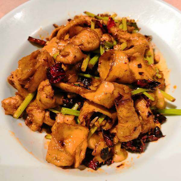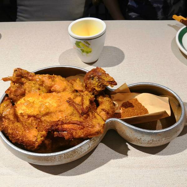 回到宾馆已经是下午了,感觉有点累,于是决定先歇会儿再出去吃晚饭。一天都没吃什么正经东西,那晚上就来吃顿好的吧。手机一搜附近正好有个万达广场,那还等什么呢,走着~生意火爆,还得等位儿,不过等位期间还有店里提供的免费酸梅汤可以喝~葫芦鸡 来西安怎么能不尝尝有名的葫芦鸡呢,真的是外酥里嫩,好吃极了!它跟普通的炸鸡可不一样,它的外皮是没有裹面而炸出来的酥脆。能看出来这是什么菜么?哈哈~炒面筋光有菜没有主食怎么行呢?看了菜单实在没有想吃的主食,于是趁等菜的间隙,我去附近买了一份海鲜面。