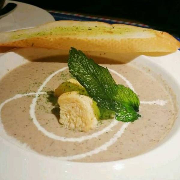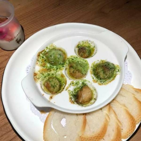 奶香南瓜汤,南瓜味很重,香甜,配着面包吃绝了蒜香黄油煸蜗牛蜗牛肉还比较大,嚼起来有弹性,蒜香味很浓,好吃。