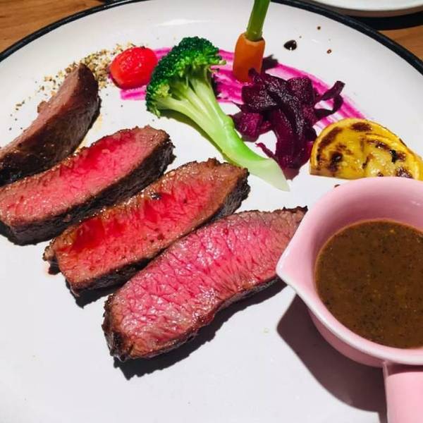 我喜欢的菜品还是保持不变的牛排,西式牛排,这也是这家餐厅的主打招牌菜品菜品食材是用澳洲谷饲料精心饲养的豪佳牛肋排,🌸🌸🌸肋排经过了精心挑选,很大一块。要得七分熟,师傅烤制得恰到好处。蘸酱汁吃起来又嫩又鲜,美观的排盘看起来也很十分舒服。