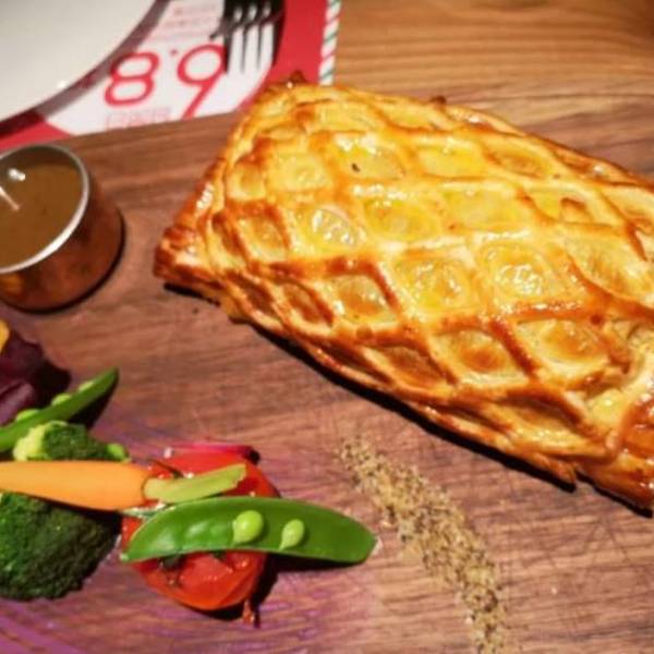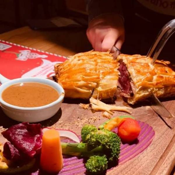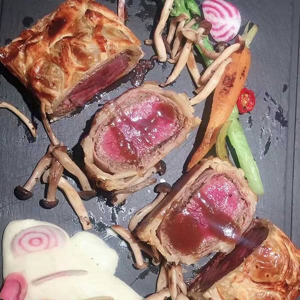 饭点的时候人很多,但是服务还是很在线的。惠灵顿牛排果然好吃,很惊艳的摆盘,外层的酥皮口感酥脆,被层层包裹下的牛排很鲜嫩。...以前看孙红雷的电视剧就一直想吃这个惠灵顿牛排,因为限量,提前打了电话预定的。