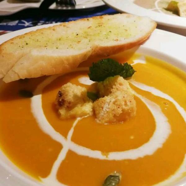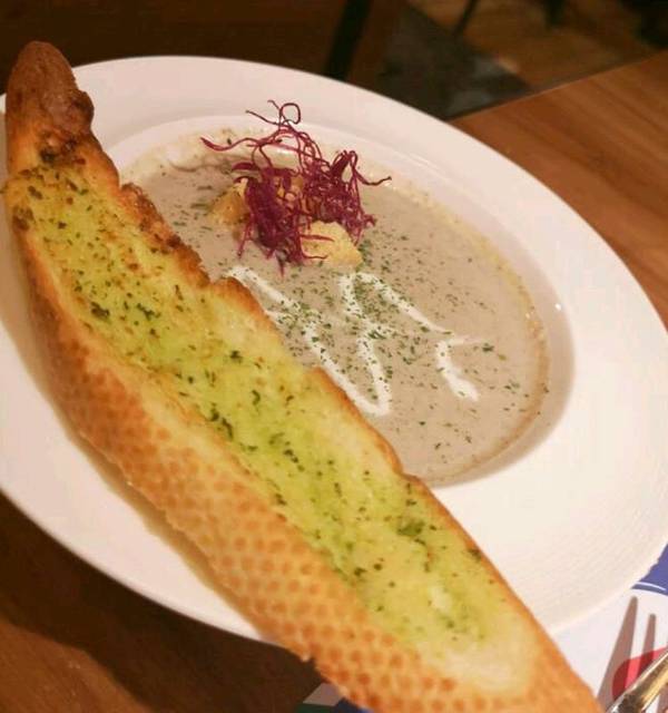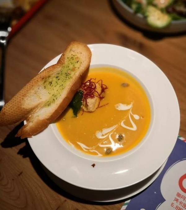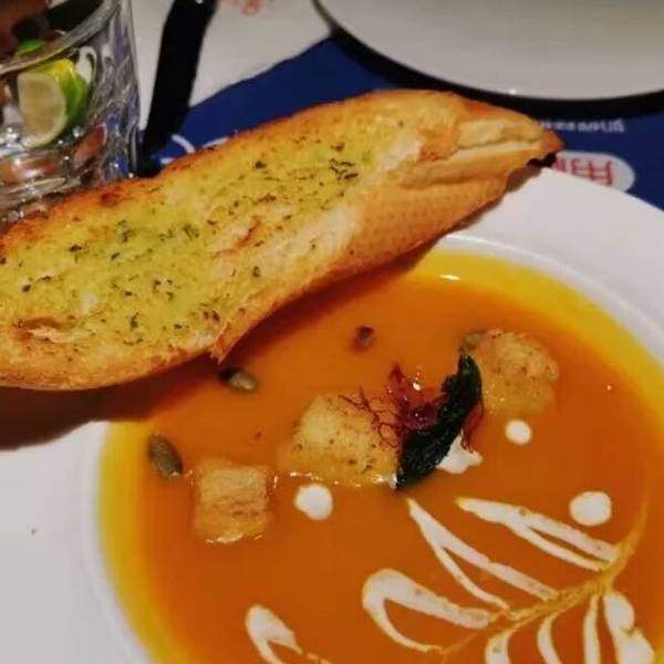 然后菜品比较多,不踩雷:奶香南瓜汤,😜😜😜前莱之一,味道醇厚,奶香浓郁.配的蒜蓉面包,脆硬刚好